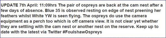 Both birds have been on the nest this afternoon (about 5.30pm), White YW delivered a fish to Blue 35 and then set about a bit of nest tidying and then nest cupping.